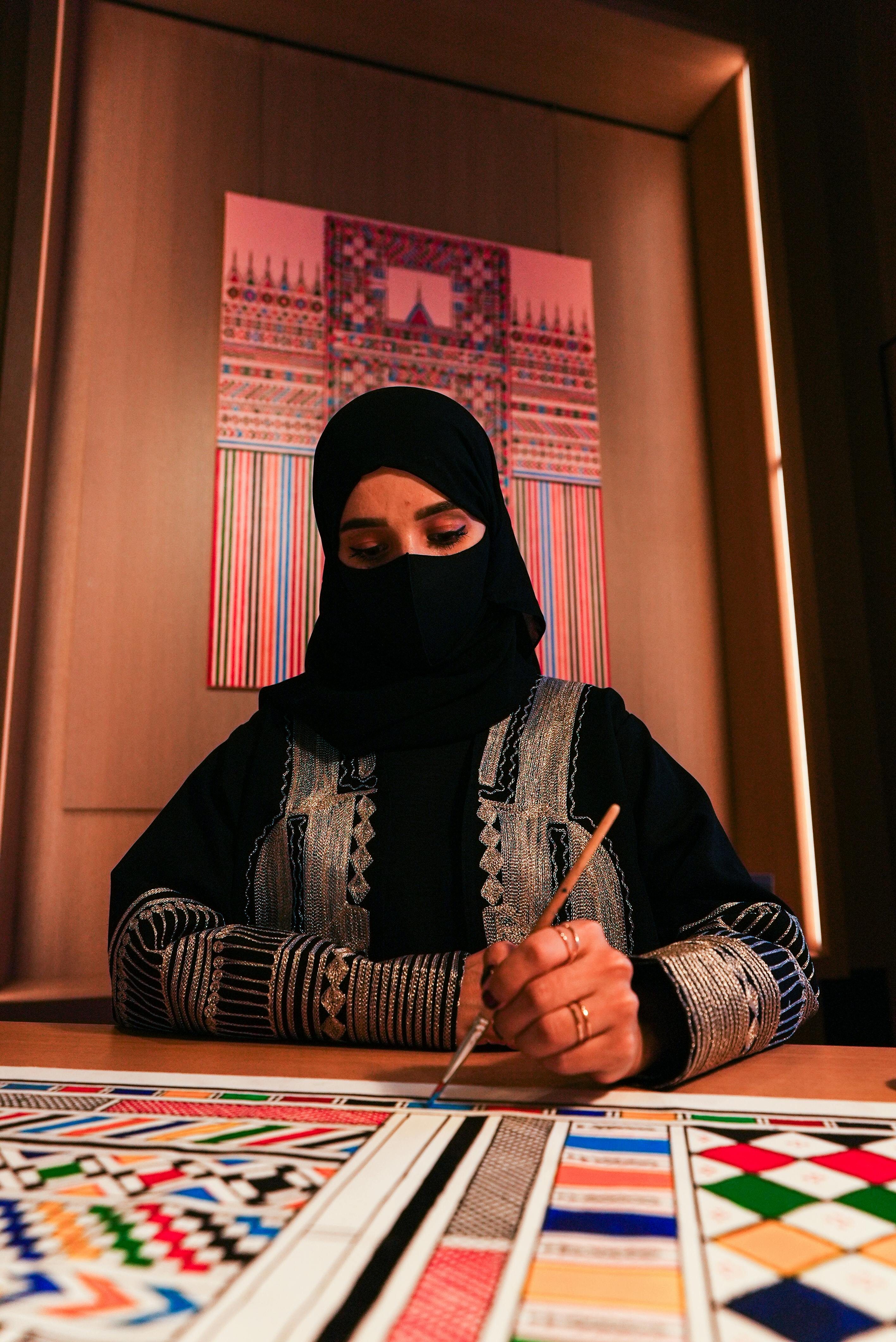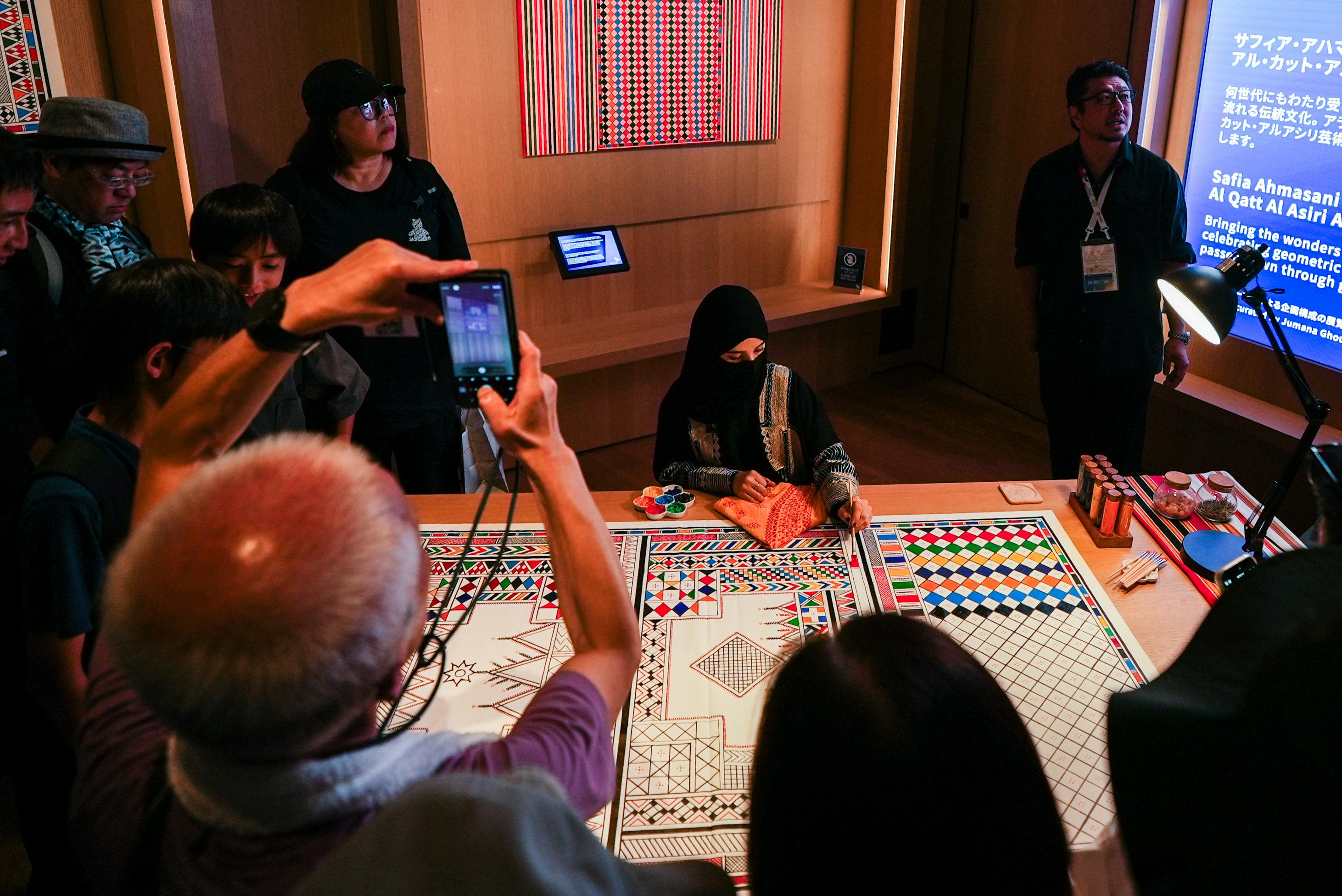 At World Expo 2025, DDX collaborated with the Kingdom of Saudi Arabia’s Ministry of Culture to deliver a vibrant programme of exhibitions and residencies at the Saudi Pavilion, offering visitors an immersive journey into Saudi creativity. Among the highlights, Safia Ahmasani, a leading practitioner of Al-Qatt Al-Asiri, brought the rich visual language of Aseer to life, showcasing the intricate geometric patterns and cultural traditions passed down through generations of Asiri women.