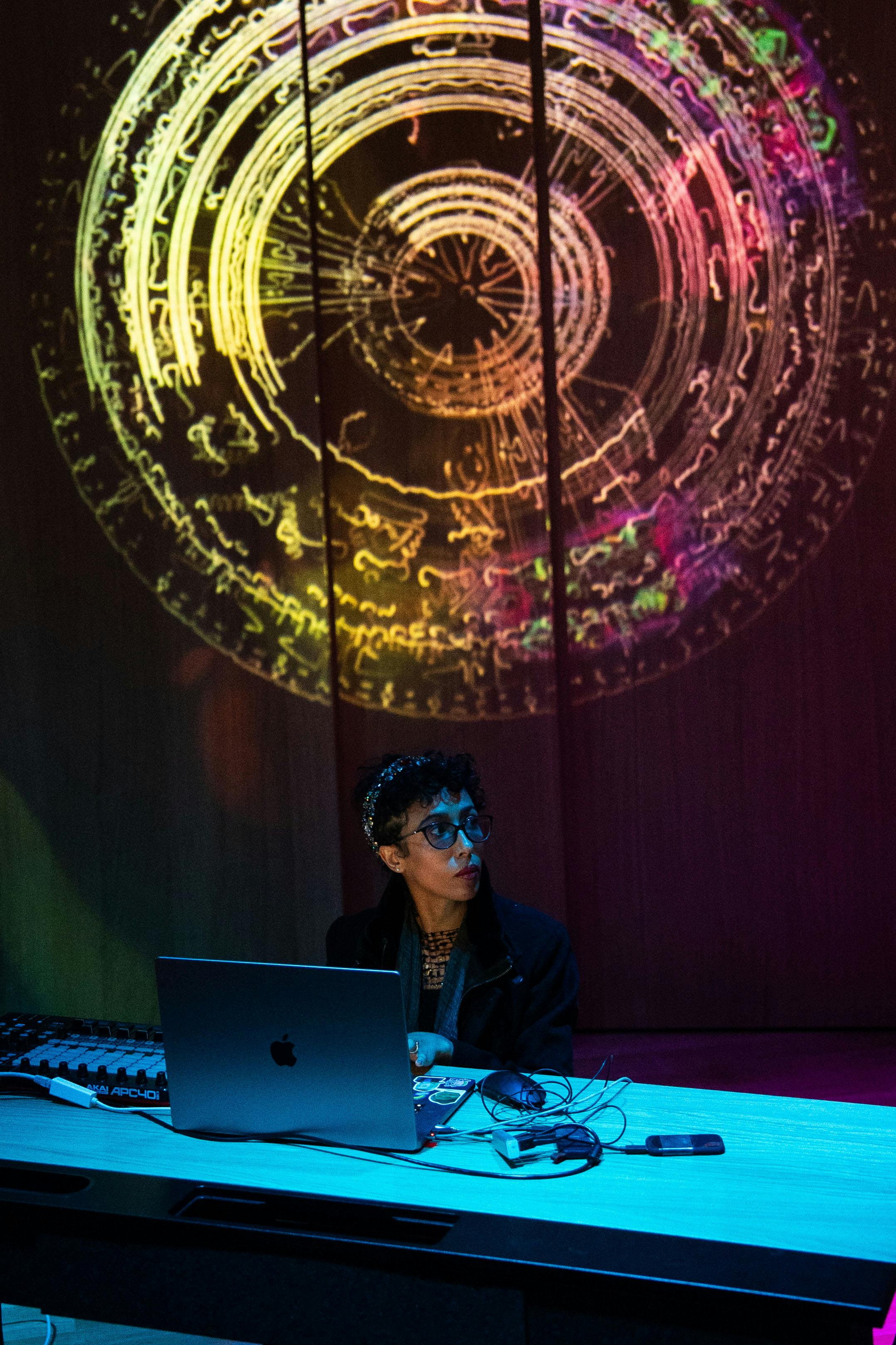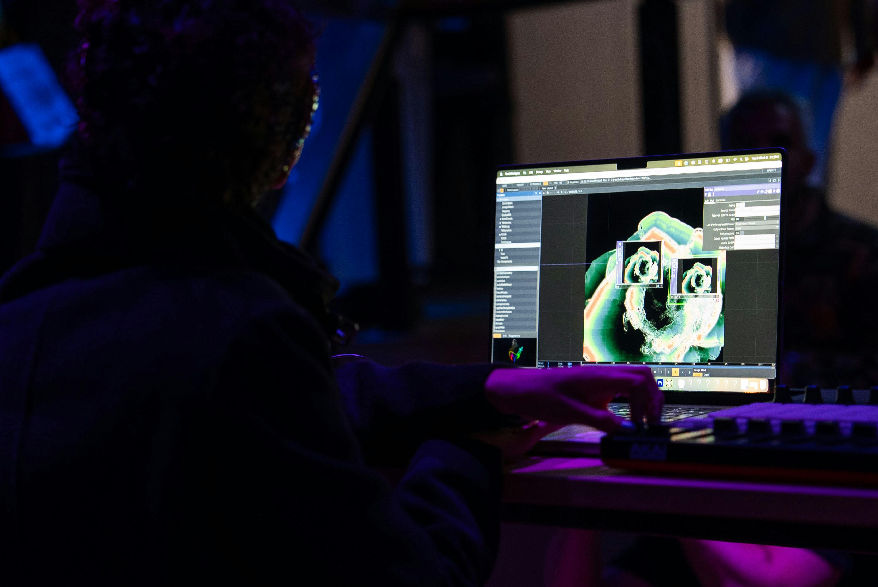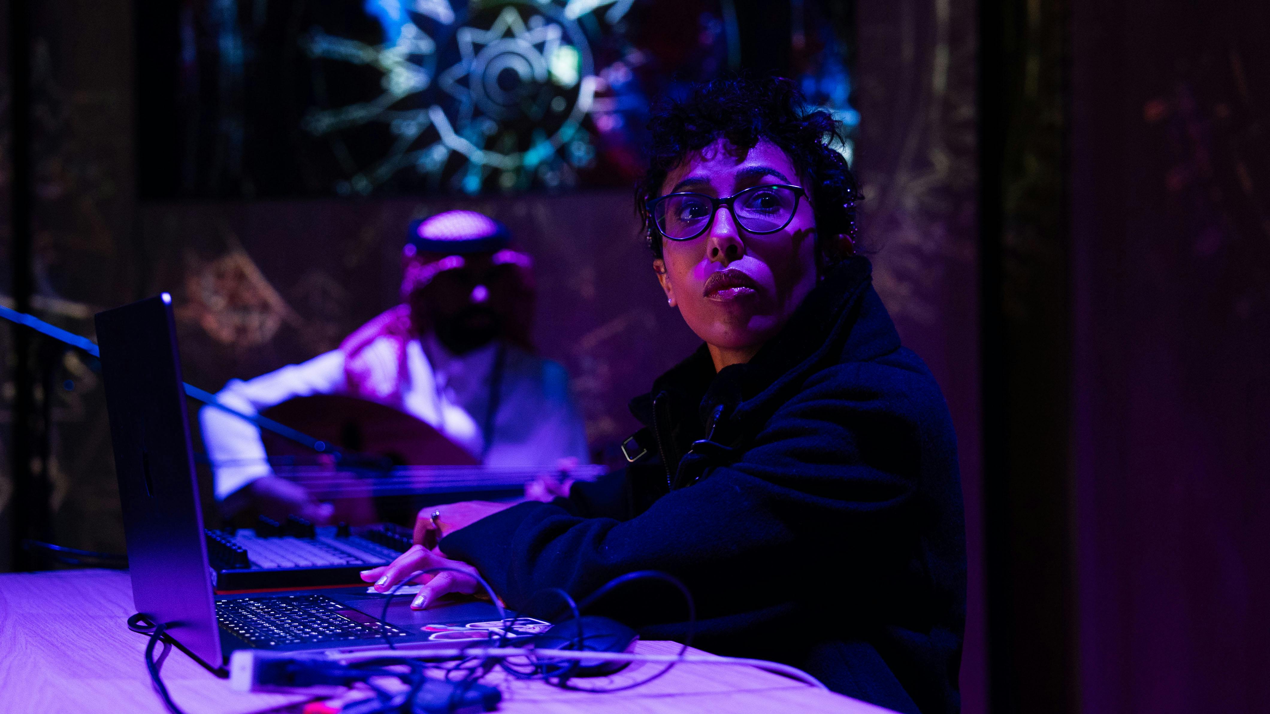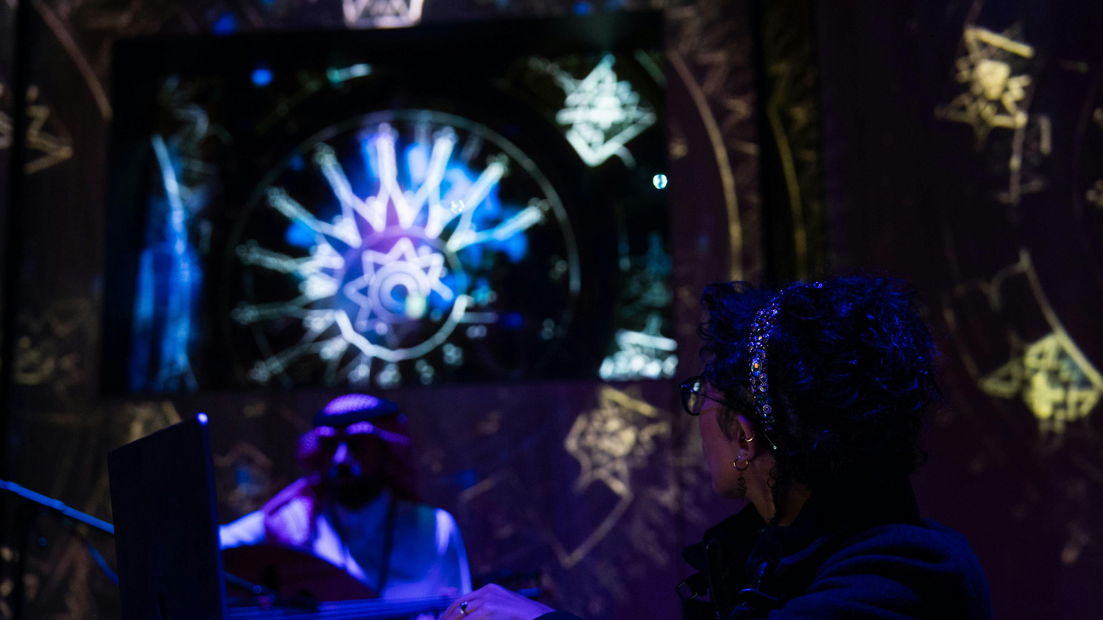 During live performances, she collaborated with Saudi musician Faisal Alqarni to develop soundscapes that enriched the studio’s atmosphere while projecting live compositions onto the walls. The evolving display, featuring colours, motifs and patterns inspired by Saudi Arabia’s diverse villages including Al Soudah, transformed the space into a living canvas that shifted with each session. Visitors witnessed both her artwork and creative process as she reshaped the environment in real time, blending cultural memory, modern technology and artistic interpretation.