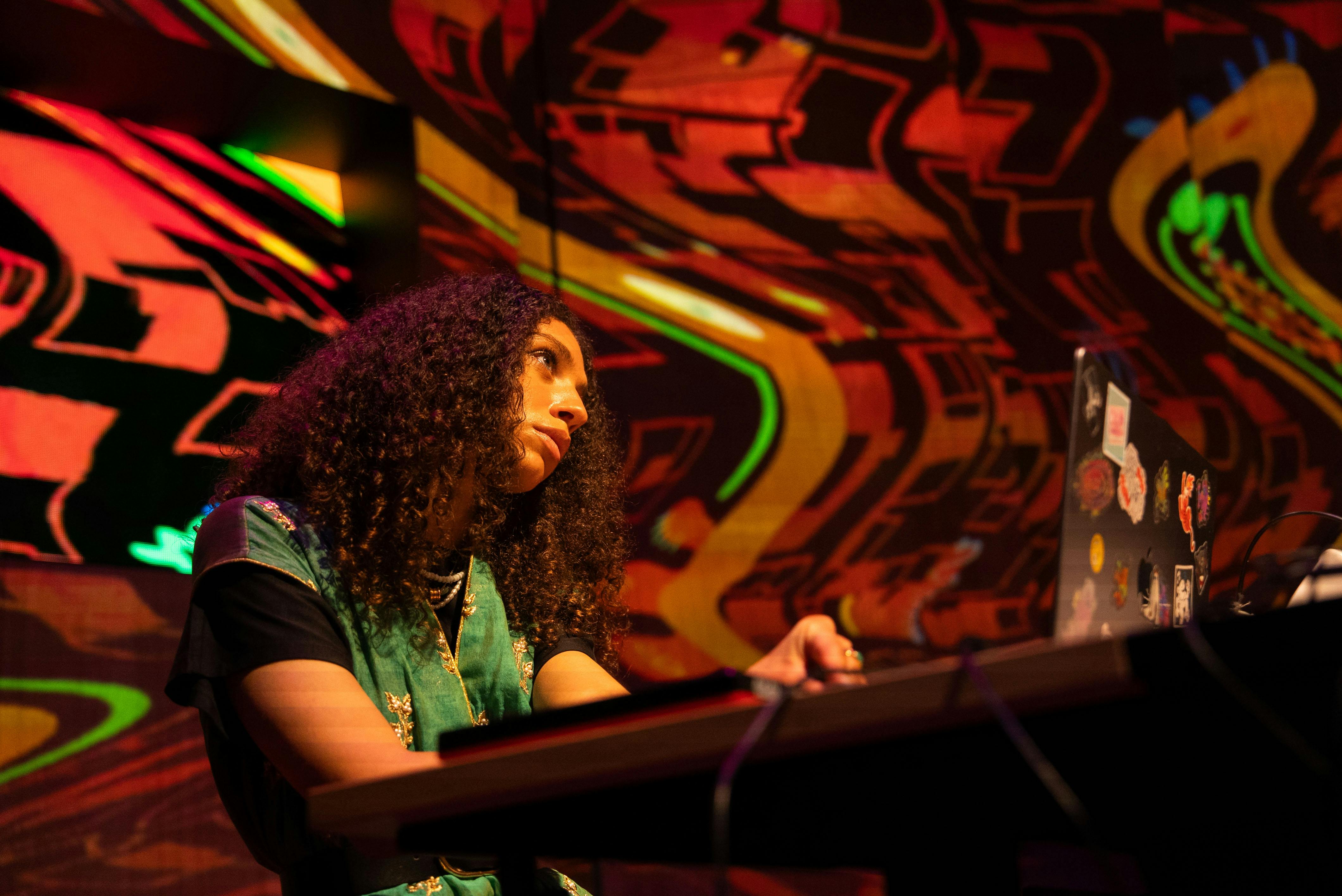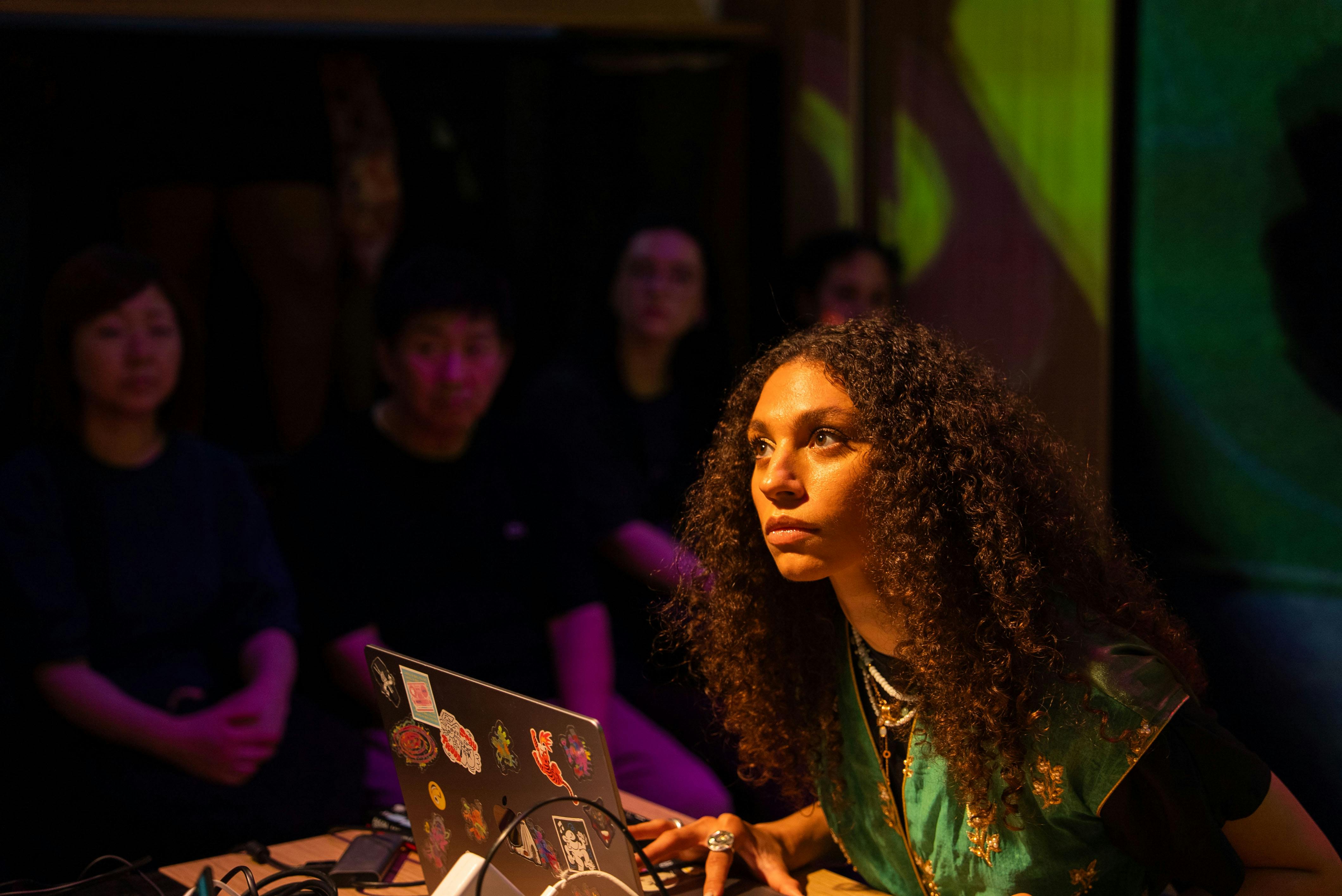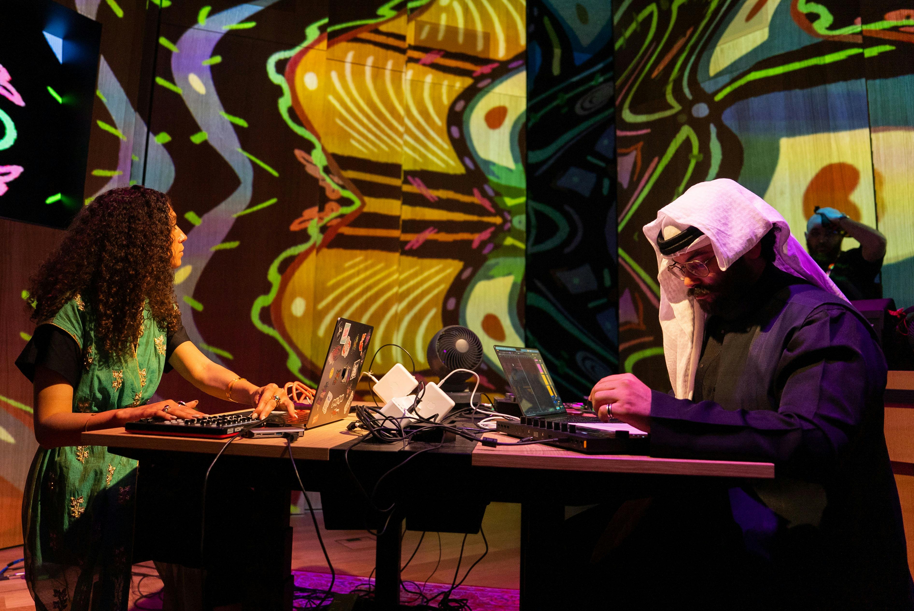 The residency, titled Infinity and Continuity, resulted in a live audio-visual performance built on an electronic soundbed influenced by technology and gaming culture, layered with Saudi cultural sound. Animated, hand-drawn, Saudi-inspired visuals were created and manipulated live, then projection-mapped to the studio walls, enveloping the space in a fully immersive environment.