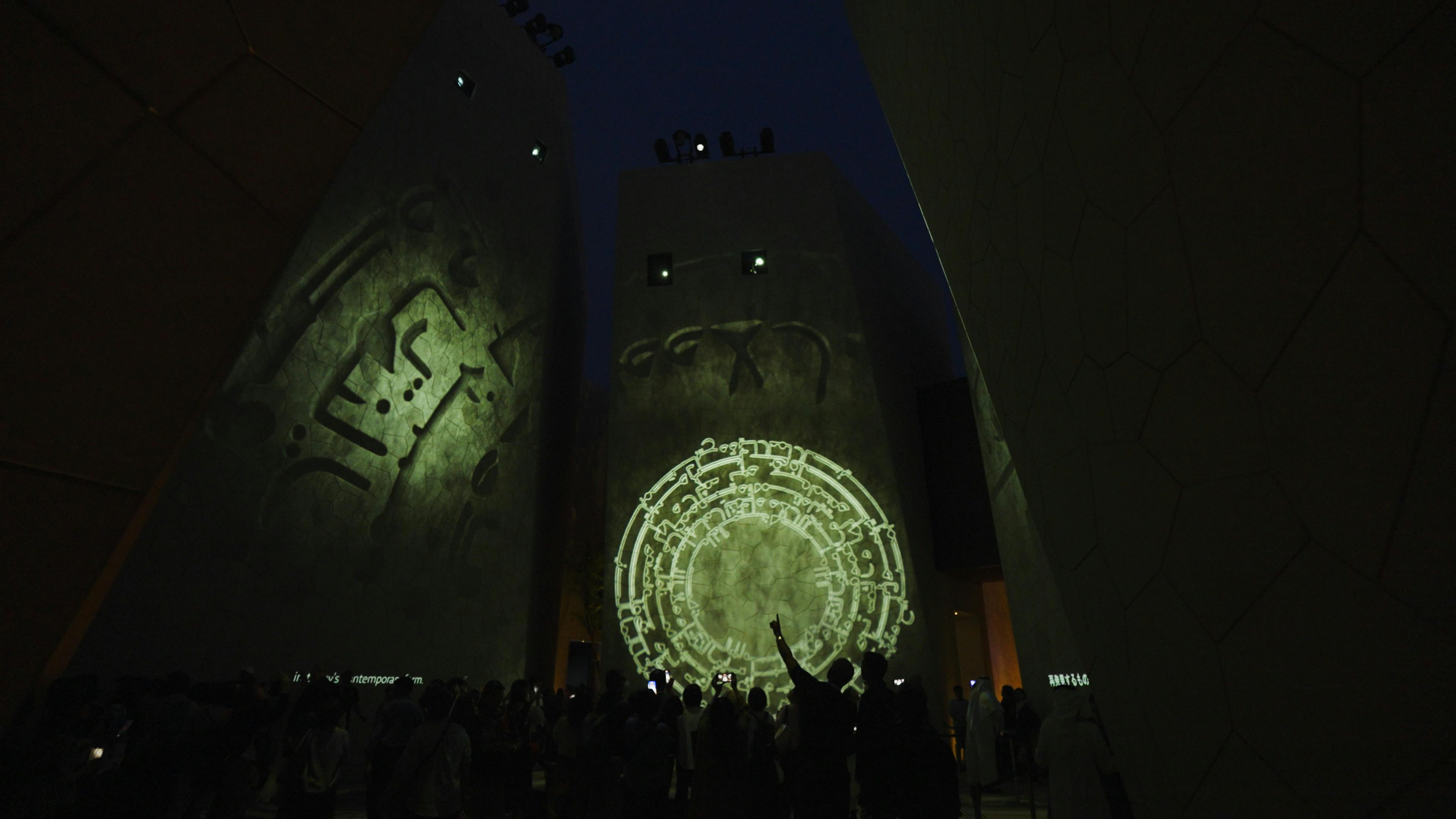 Each evening, the Pavilion’s Courtyard was transformed through 635 nightly projection-mapped shows - a series of evolving audio-visual spectacles that brought the artists’ works, performances and studio recordings to life. New creations developed on-site were continually added, ensuring every participating artist was celebrated in a dynamic nightly highlight that felt alive, contemporary and uniquely Saudi.
